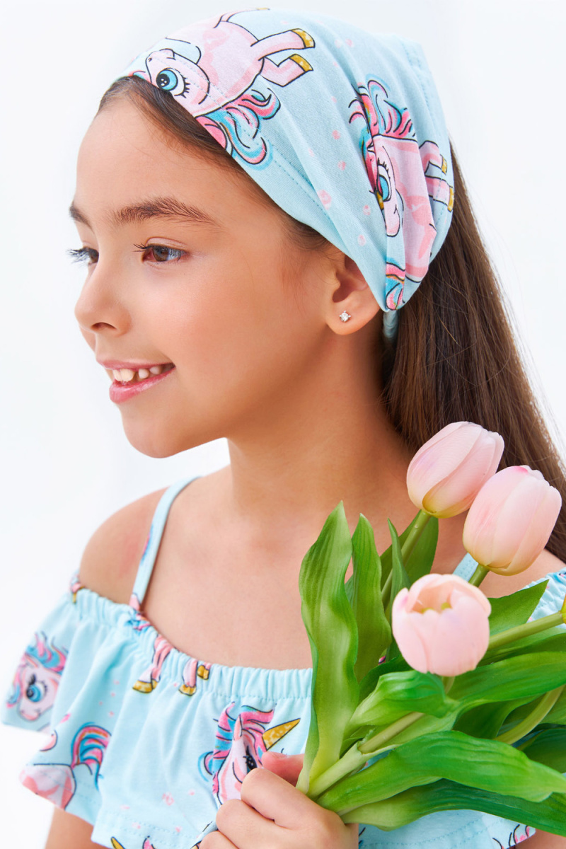 Стильная, яркая косынка для девочек. Встроенная резинка в изделия позволяет косынке прочно держаться на голове. Незаменима в жаркие летние дни.