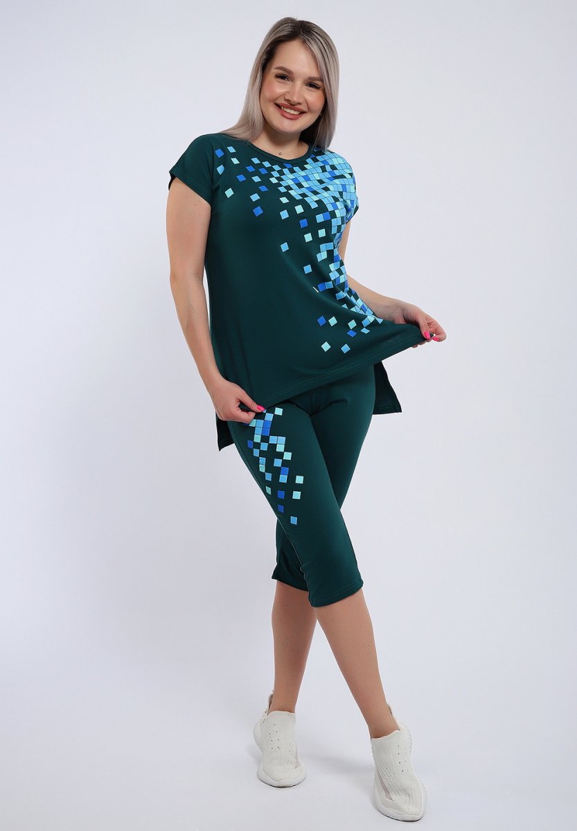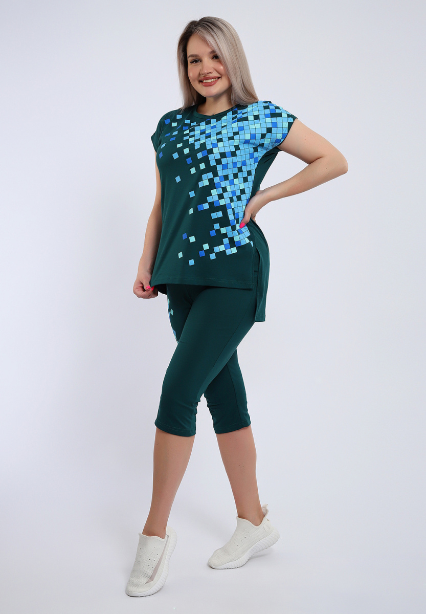 Женский костюм, состоящий из футболки с удлинённой спинкой и бриджей, выполнен из лёгкого и приятного на ощупь материала — 100% хлопка в исполнении кулирной глади. Элегантный геометрический принт "Пиксели".