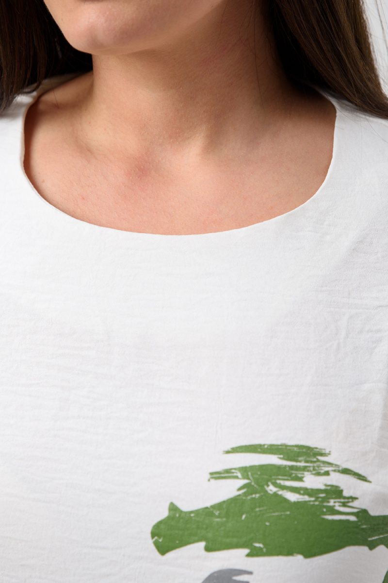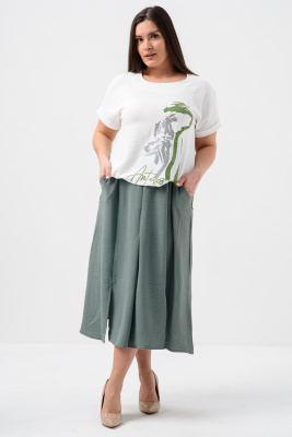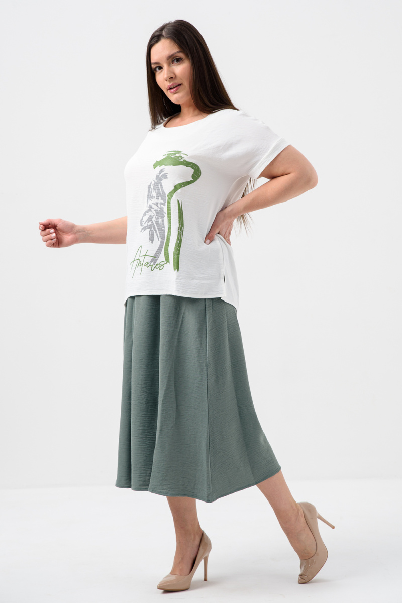 Женская двойка прямого силуэта. Верх комплекта в белом цвете с цветным принтом, короткий цельнокроеный рукав, низ футболки имеет свойство затягиваться, поэтому ее можно носить спущенную на юбку, а можно затянуть и оставить над ней, что подчеркнет вашу талию. Низ - свободная юбка двух цветов, с двумя разрезами снизу. Костюм повседневный и удобный, из легкой ткани сингапур, что хорошо для жаркого лета.